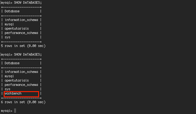 MySQL Monitor에서 SHOW DATABASES; 명령으로 'workbench' 스키마가 잘 생성된 것을 확인