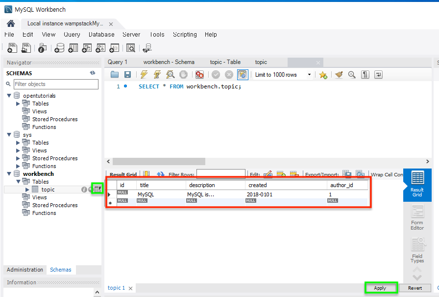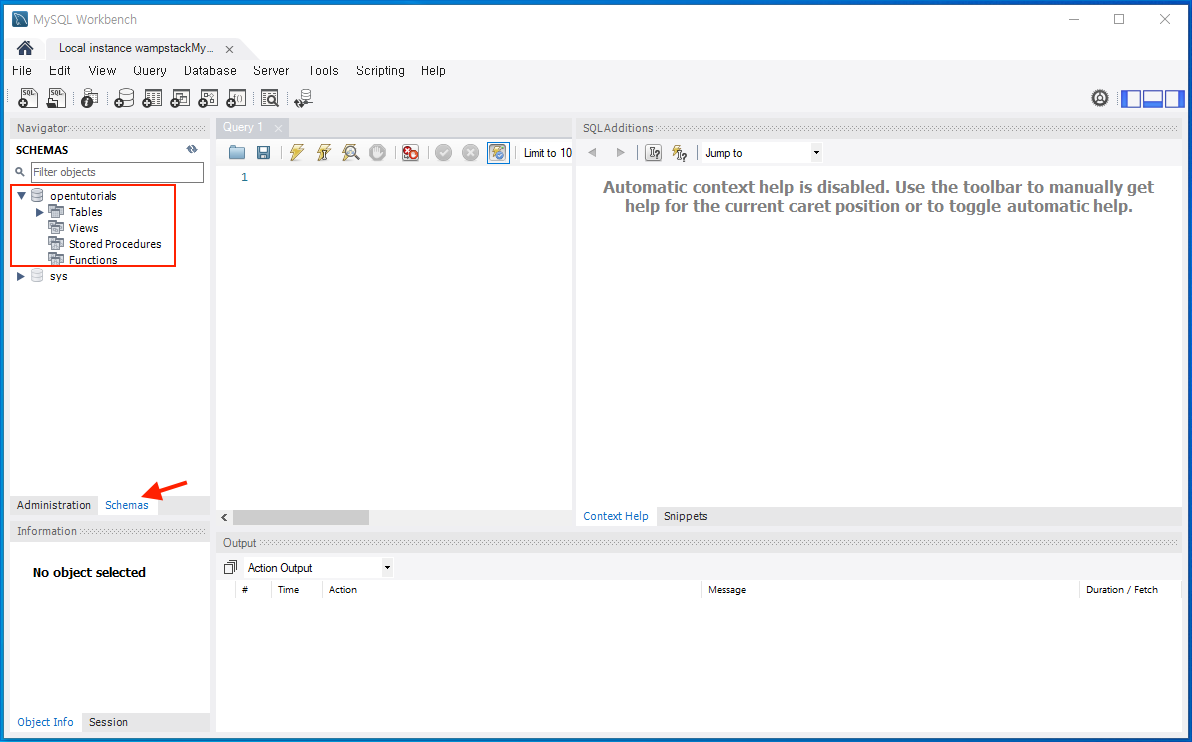 [Schemas] 탭을 클릭하면, 이전에 MySQL Monitor를 통해서 생성했던 'opentutorials' 데이터베이스가 확인된다.