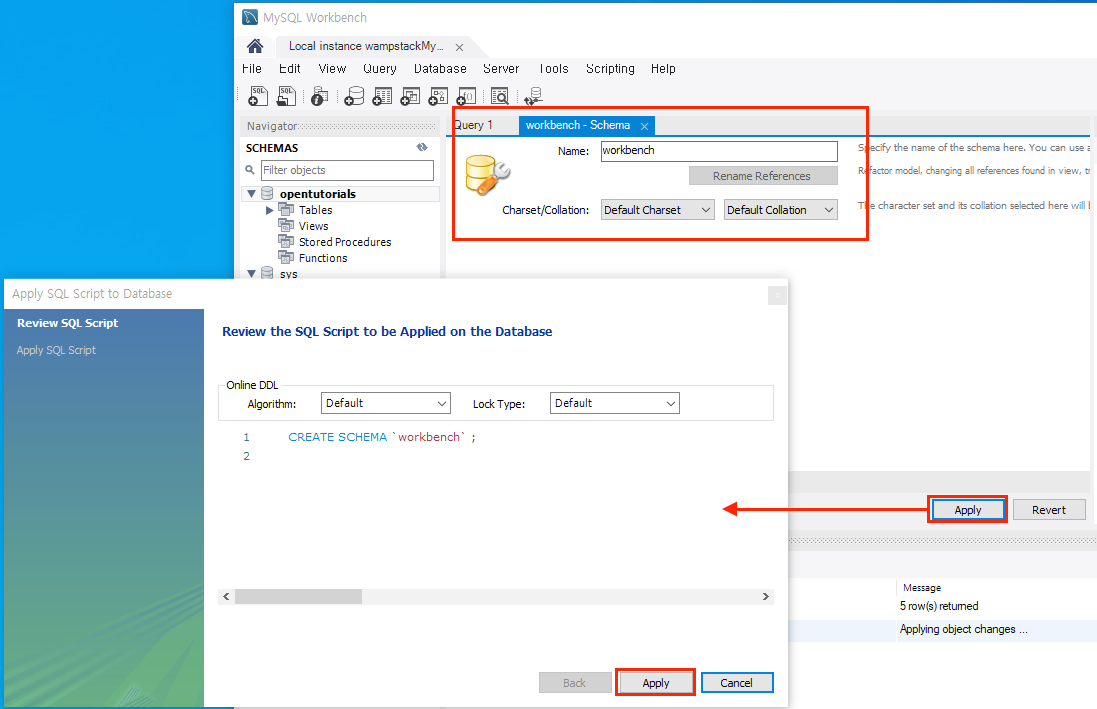 Schema Name 입력 후, [Apply]를 클릭하면, 지금 하고자 하는 작업에 해당되는 SQL문을 보여준다. 여기서 [Apply]를 클릭하면 SQL문이 실행된다.