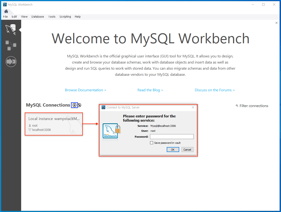 default로 Local MySQL Server로 접속하는 북마크가 생성돼있다. root 계정에 대한 비밀번호 입력 후, 접속 가능