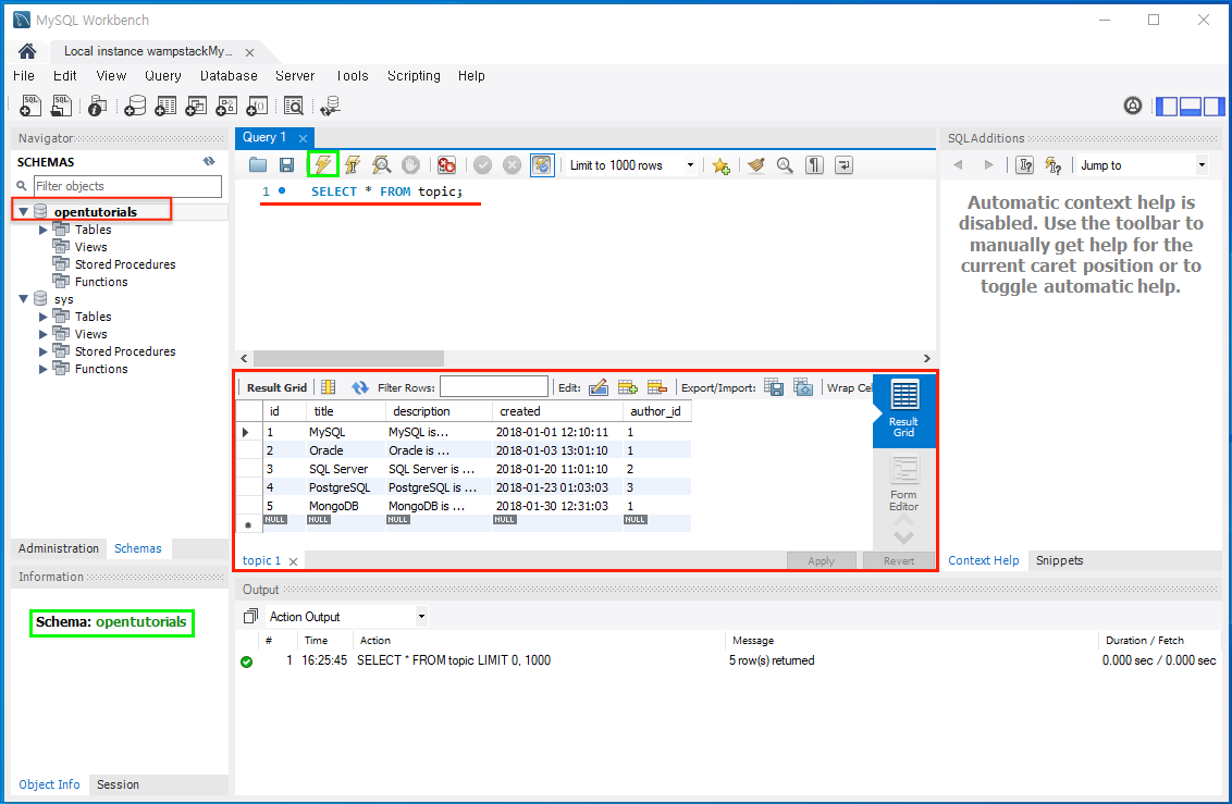 'opentutorials' 스키마를 클릭하면, [Information]에서 현재 선택한 스키마 정보를 확인할 수 있고,