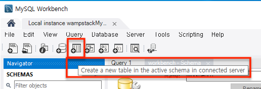 '볼드체'로 선택된 스키마가 Query에 내리는 명령에 대한 대상이 된다. [Query]에서 sql문을 작성 후, [번개] 아이콘을 클릭해서 실행한다.