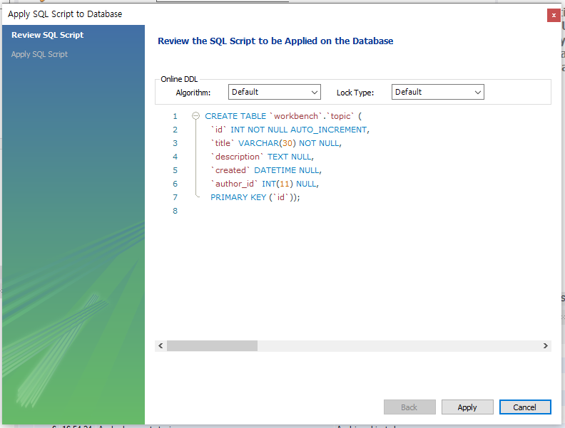 [Apply]를 클릭하면 다음과 같이 실행하려는 작업에 대한 SQL문을 확인할 수 있다. 여기서 [Apply] 하면 SQL이 실행된다.