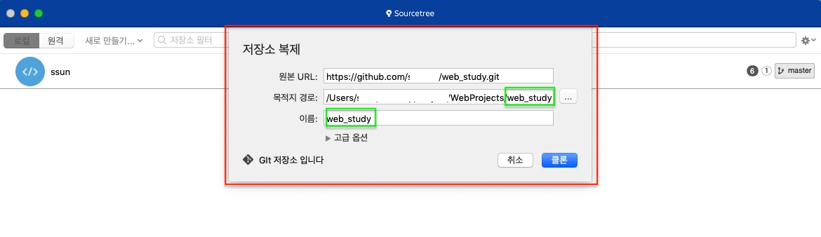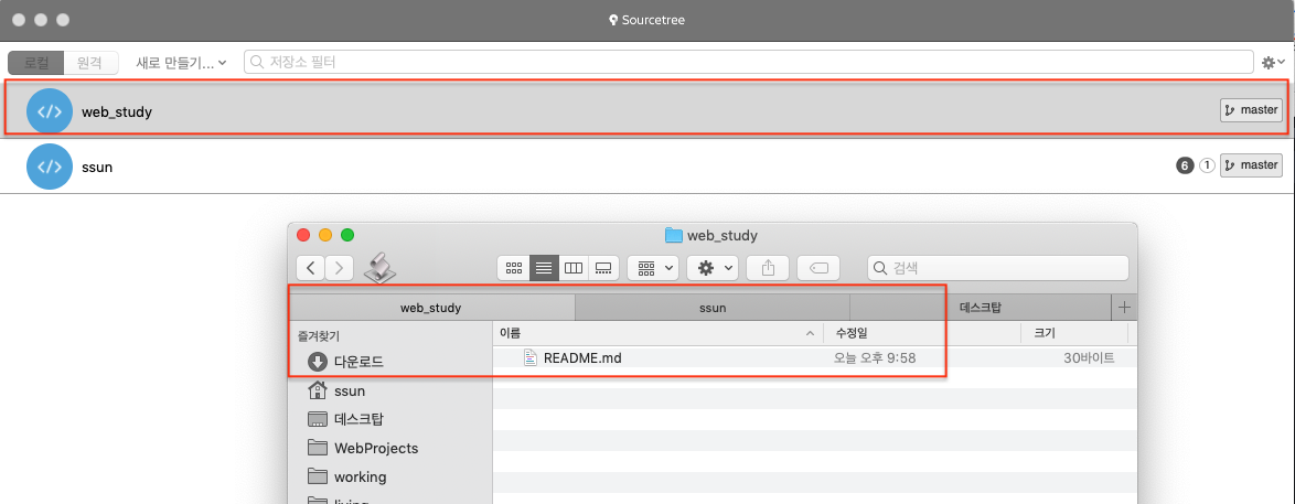 Sourcetree 북마크에서 연결된 저장소 정보를 확인할 수 있다.