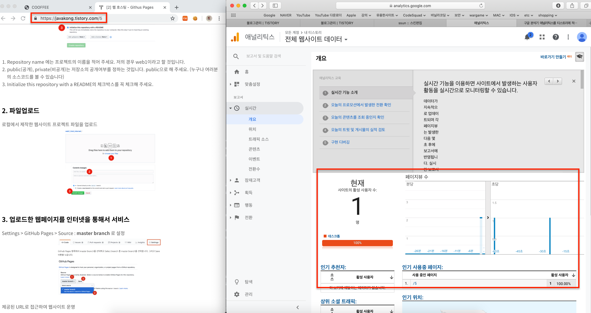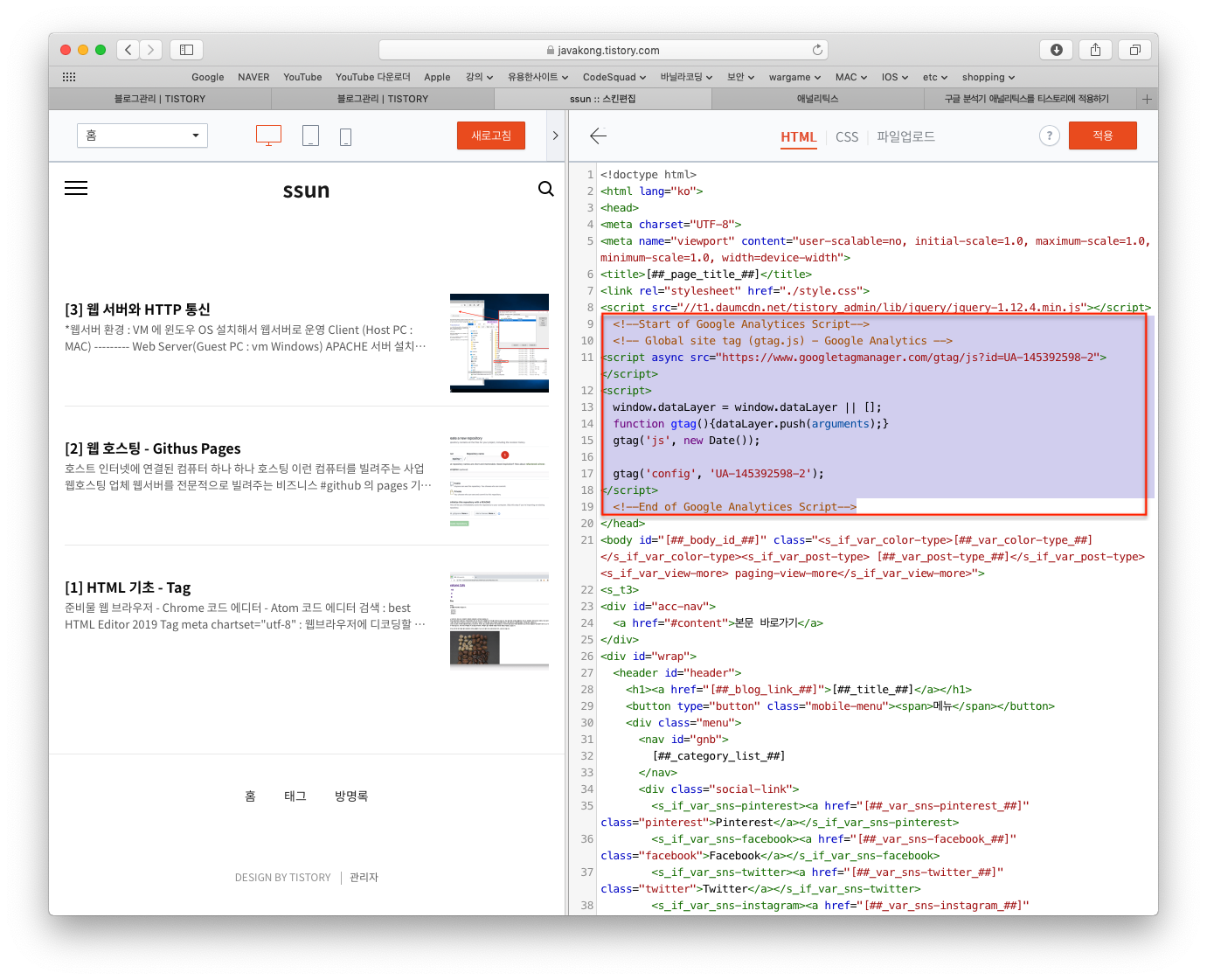 - HEAD 태그 내에 애널리틱스에서 복사한 코드 삽입