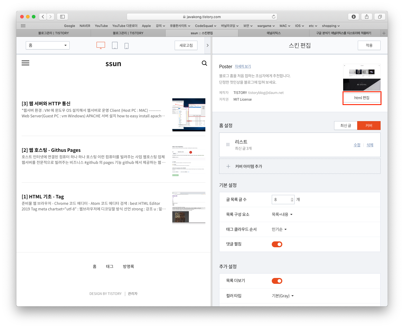 - 티스토리 관리자 페이지에서 스킨 편집 > [HTML 편집]