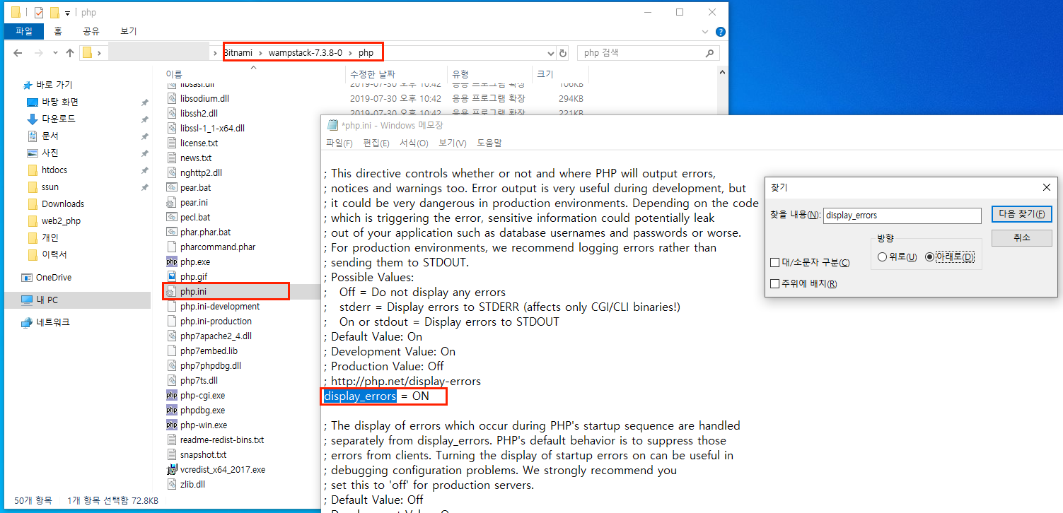 - ctrl + F (검색) : display_errors > [다음 찾기] > 앞에 세미콜론(;)이 붙어 있지 않은 부분을 찾기