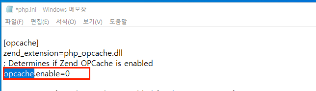 이 옵션이 켜져 있다면, PHP가 같은 시간 동안 더 많은 웹페이지를 만들어 낼 수 있다. 하지만 켜져 있으면, PHP 파일을 수정해도 바로바로 반영되지 않고 약 30초 ~ 1분 정도 시간이 지난 후에 수정한 내용이 웹페이지에 반영되는 불편함을 겪을 수가 있기 때문에, 개발 시에는 opcache.enable = 0 으로 끄는 것이 좋다.