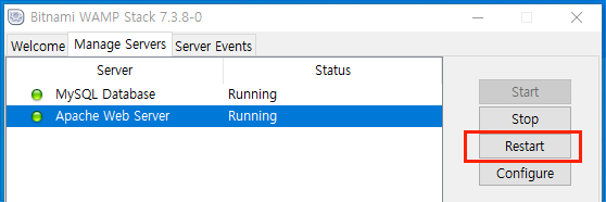 Binami 를 이용해서 Apache, MySQL, PHP를 설치했다면, 비트나미 매니저 프로그램 (manager-windows)을 실행시켜서 웹서버와 데이터 베이스 서비스를 시작, 중지할 수 있다. Start 버튼을 클릭해서 웹서버를 시작(초록불 상태) 시켜야 제대로 동작한다.