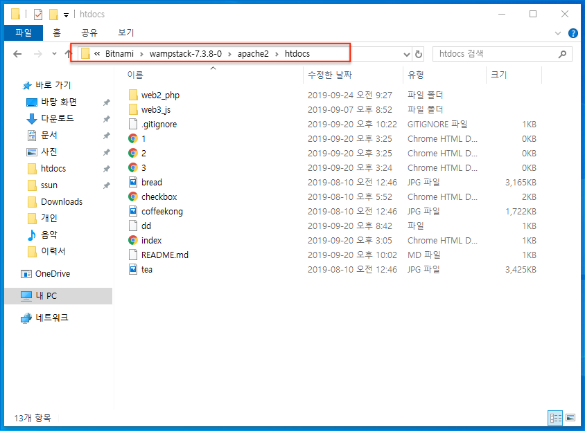 실습은 apache 디렉토리 하위에 "htdocs" 디렉토리에서 진행하면 된다.