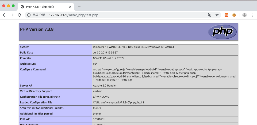 웹브라우저에서 test.php를 로드시켰을 때 다음과 같은 페이지가 나오면 성공적으로 PHP를 설치한 것이다.