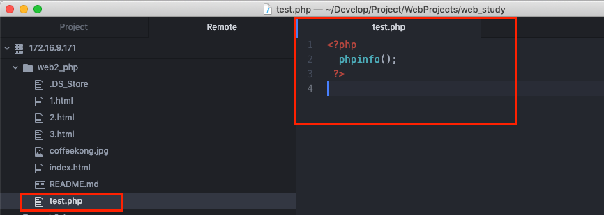 Atom 에디터에 htdocs 디렉토리를 프로젝트 폴더로 추가하고 test.php 파일을 생성