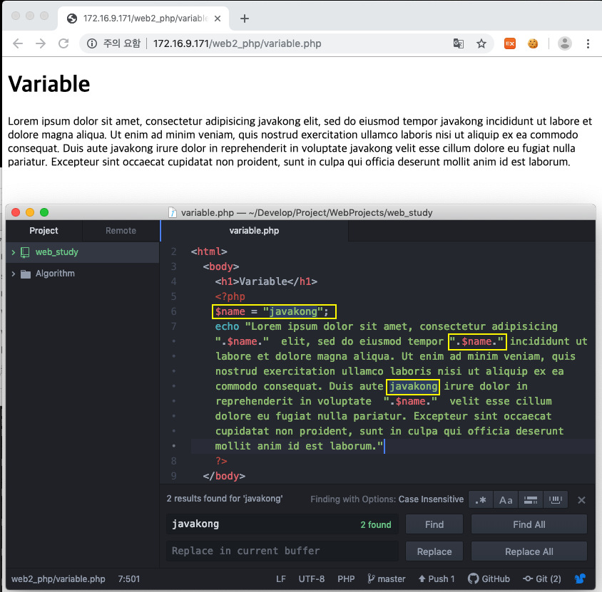 텍스트 중간중간에 'javakong' 닉네임을 하드코딩 하였다.