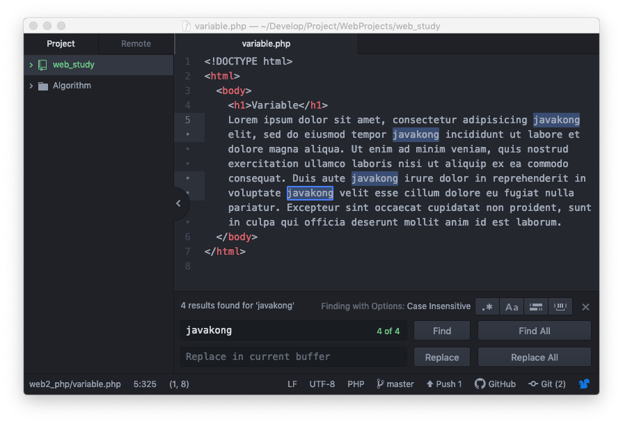 아톰(Atom)편집기에 'lorem'이라고 치고 탭(tab)키를 누르면 아무런 의미가 없는 랜덤한 샘플 텍스트를 생성해준다.