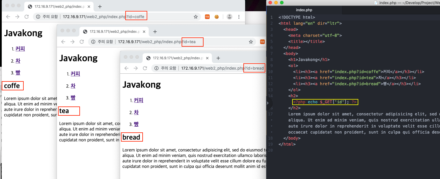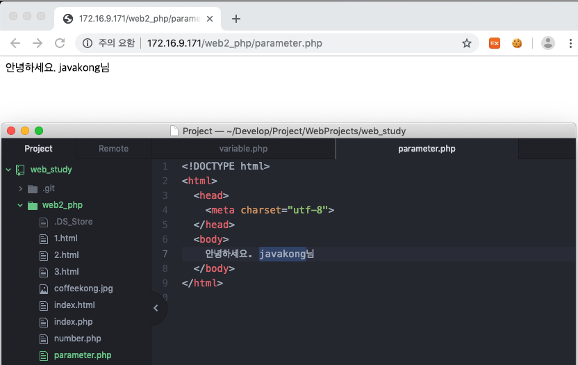 http://172.16.9.171/web2_php/parameter.php?name=javakong 의 의미는 parameter.php라는 웹 애플리케이션에 name=javakong이라는 입력값을 준 것이다. 그러면 parameter.php 애플리케이션은 name이라는 변수의 값으로 입력받은 값 'javakong'을 웹페이지의 이름 부분에 출력하게 하는 것을 통해서, "단 하나의 parameter.php라고 하는 php 애플리케이션을 통해서 무한히 많은 웹페이지를 무한이 많은 사람들에게 인사를 할 수 있게 된다."