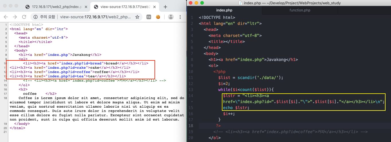 data 디렉터리에 파일(항목)이 추가되면 그것을 php가 알아서 인식해서 <li> 태그를 프로그래밍 적으로 생성하도록 한다. 관리자는 본문 파일만 추가하면 된다.