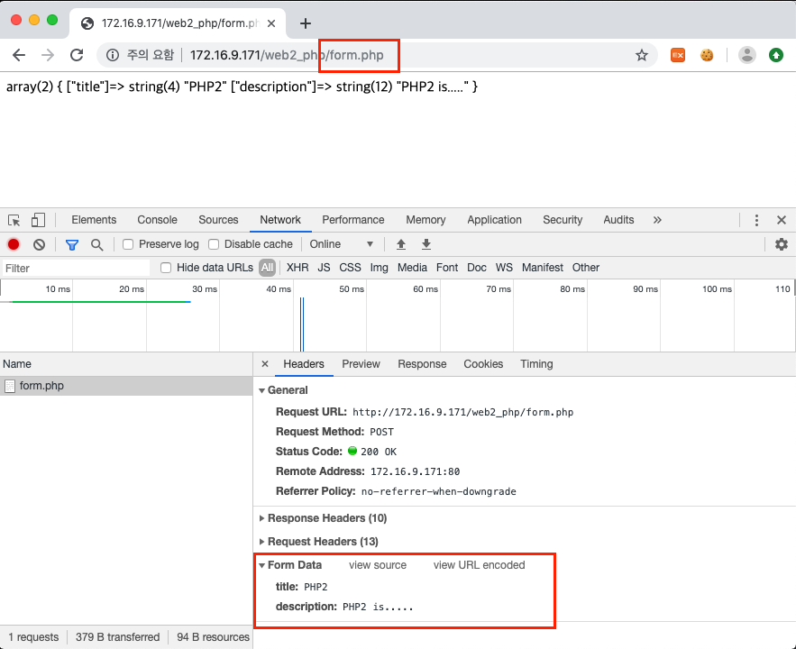 전송 후 url 파라미터에는 입력한 정보가 보이지 않고, [Network] > "form.php" > [Headers] > [Form Data] 에 사용자가 입력한 속성값이 들어가 있는 것을 확인할 수 있다.