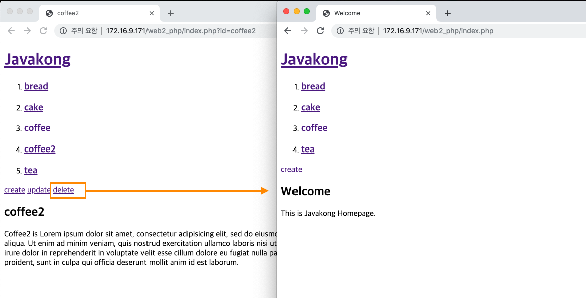 삭제는 form을 입력할 필요가 없다. delete.php 페이지는 필요 없고, delete_process.php로 바로 연결하면 된다.