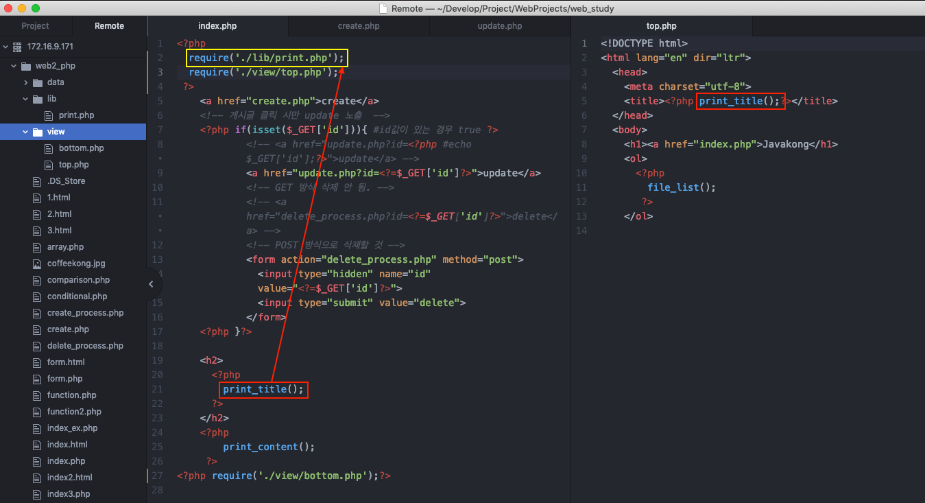 따라서 top.php 파일의 상단에도 require로 ./lib/print.php 코드를 추가해주면, top.php 파일만 봤을 때 print_title()함수가 print.php 에서 왔다는 것을 한눈에 알 수 있다.
