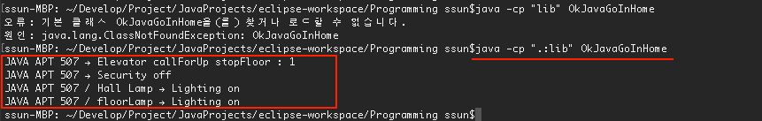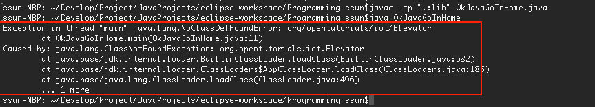 'Elevator' 클래스를 찾을 수 없어서 발생한 에러이다. org 패키지가 OkJavaGoInHome.class 파일과 같은 위치에 있었다면 정상적으로 실행되었겠지만, lib 디렉토리 하위에 org 패키지가 위치하기 때문에 경로를 찾지 못한 것이다.