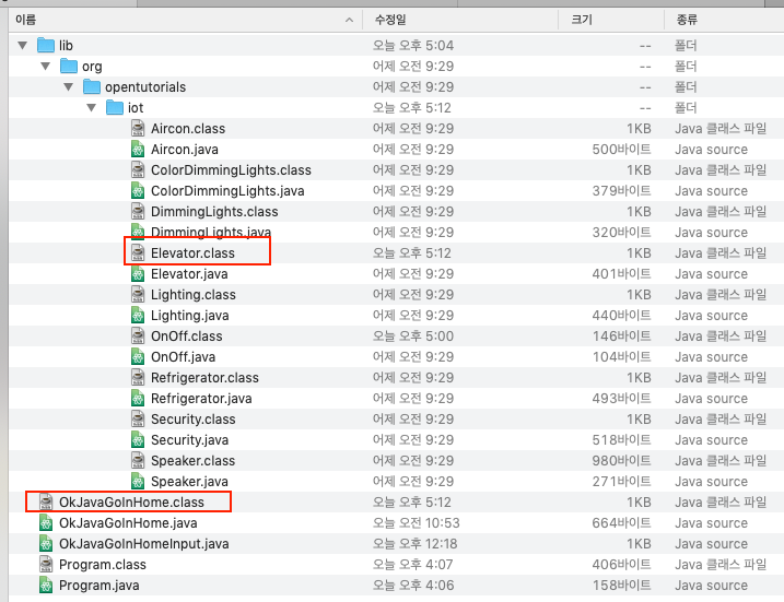 OkJavaGoInHome.java 파일이 컴파일되어 OkJavaGoInHome.class 파일이 생성되고, 이 파일에서 필요로하는 클래스 파일 Elevator.class 파일도 자동으로 컴파일해서 만들어 준다.