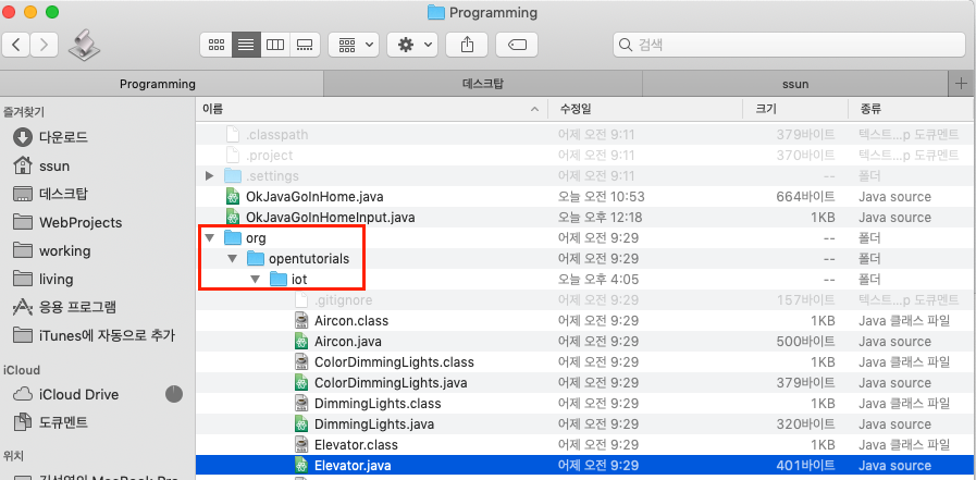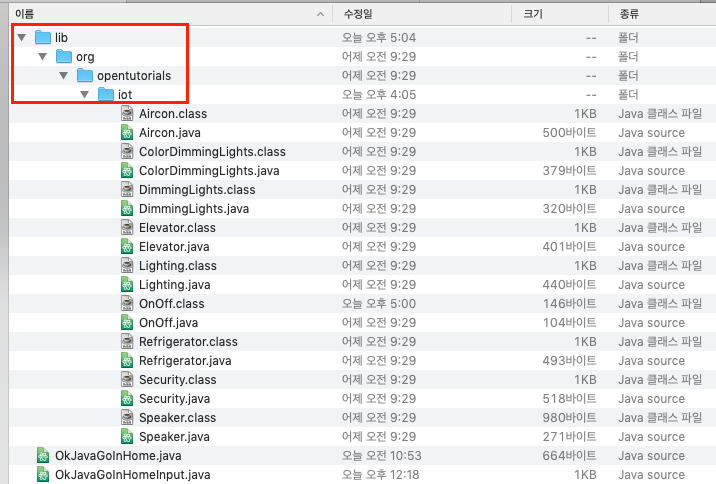 이 소스코드는 내부적으로 패키지 안에 있는 여러 파일들을 다 필요로하기 때문에 자바 컴파일러가 패키지(org.opentutorials.iot) 안에 있는 파일들도 컴파일을 시켜준 것이다.