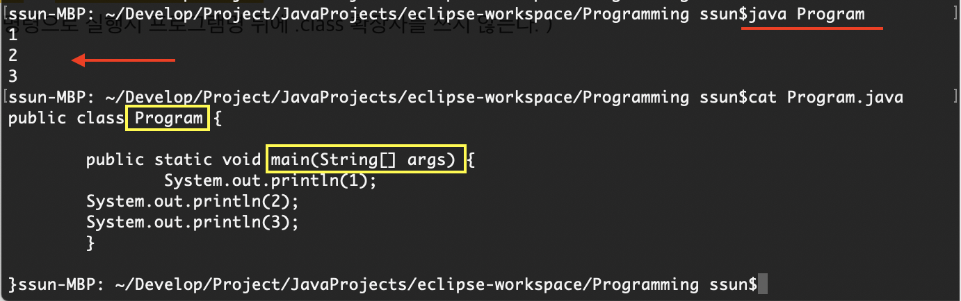 ( *주의 : java 명령으로 실행시 프로그램명 뒤에 .class 확장자를 쓰지 않는다. )
