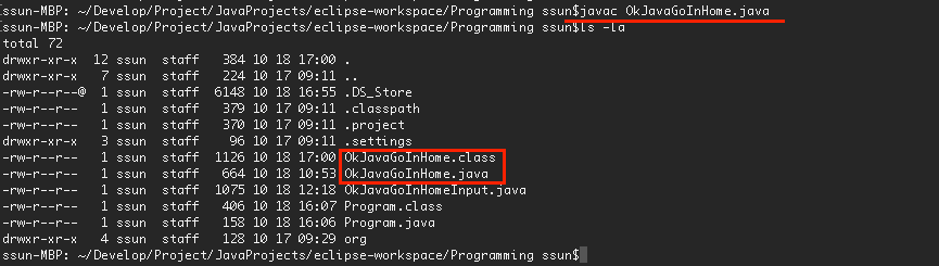 javac OkJavaGoInHome.java 에러메시지가 출력되지 않는다면 성공적으로 class 파일이 생성된 것이다.