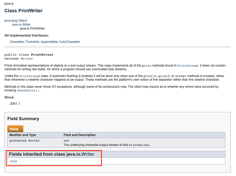 lock 이라는 변수(Field)가 Writer 클래스에 정의되어 있고, 그것을 상속받아서 이 PrintWriter도 lock이라는 필드를 사용할 수 있다.