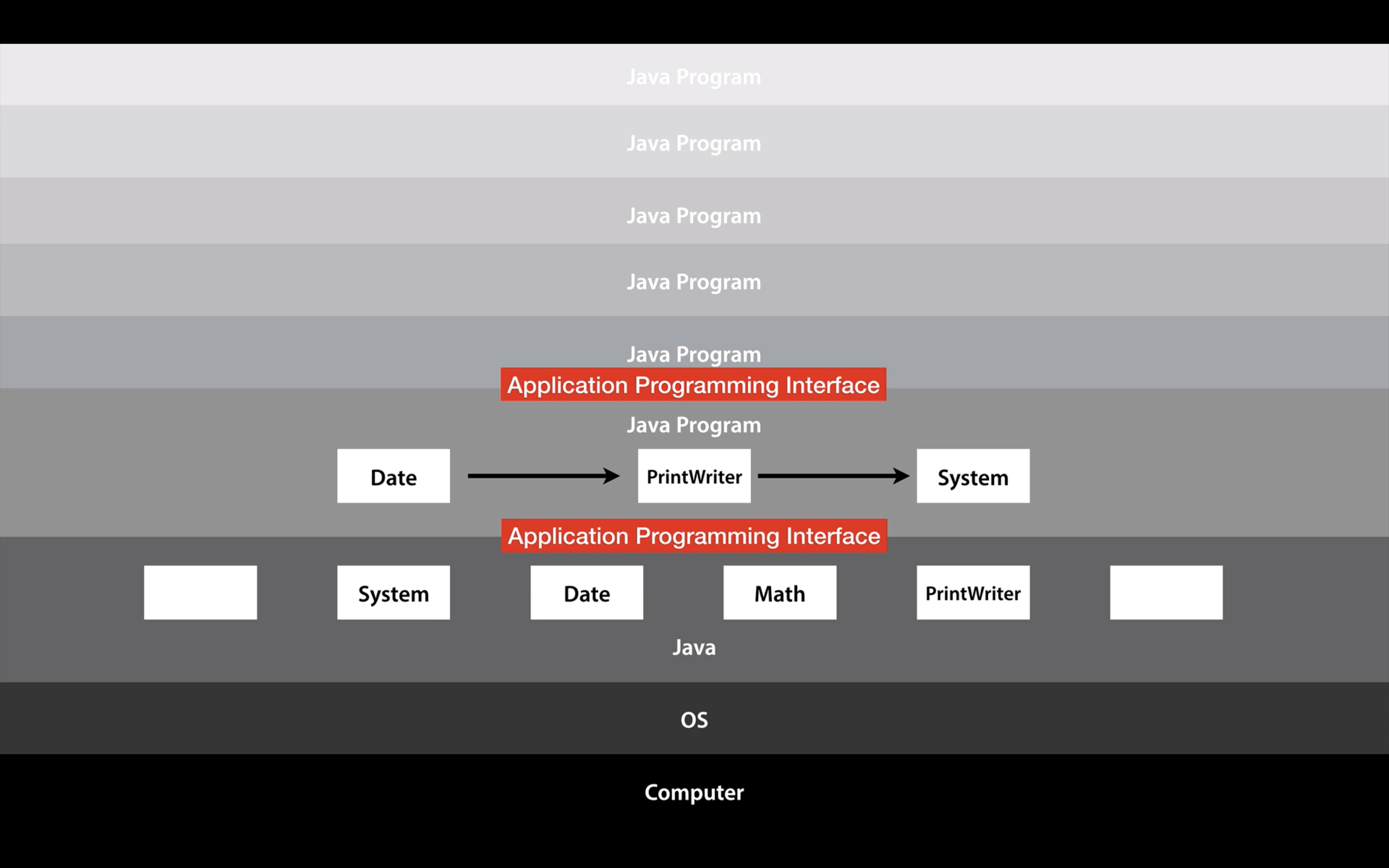 컴퓨터를 사용하려 한다. 컴퓨터를 직접 다루기 어렵기 때문에, 컴퓨터에 운영체제(Windows, MacOS etc..)를 설치한다. 그리고 운영체제에 맞는 Java 프로그램을 설치하고, 자바를 이용해서 나의 프로그램을 만들 수 있게 된다.