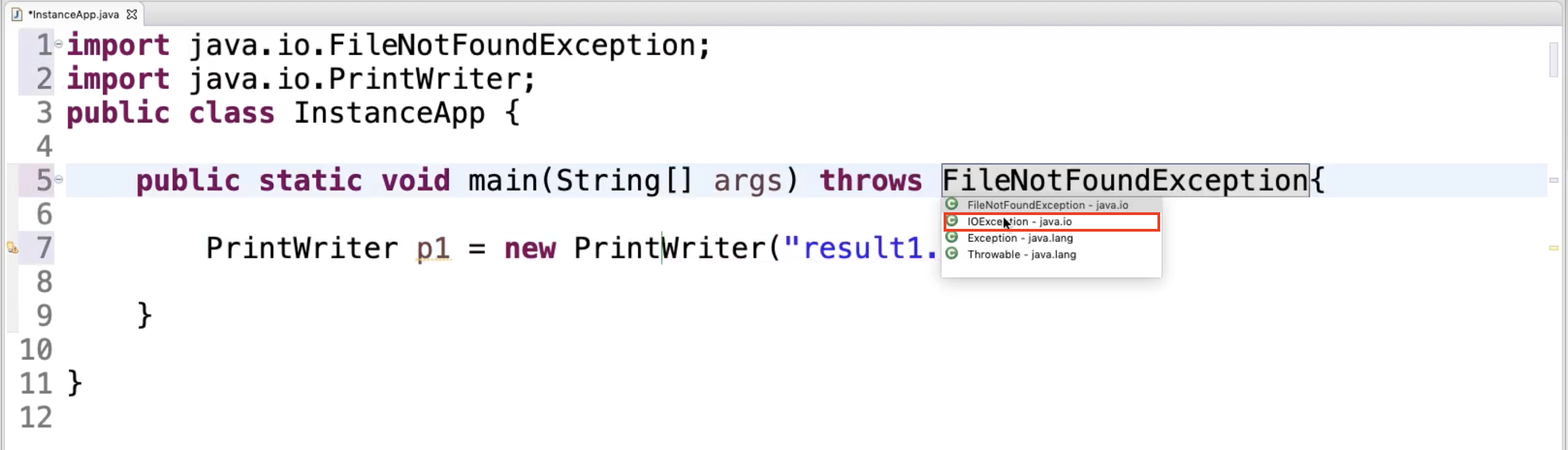 PrintWriter(생성할파일명) ()안에 생성할 파일명을 적고, new 키워드를 통해 'PrintWriter의 복제본(아바타)'를 만들어서 p1 이라는 변수에 담는다. "p1에는 반드시 PrintWriter라는 클래스의 인스턴스만 들어간다"는 뜻에서 데이터타입으로 PrintWriter를 지정해준다.