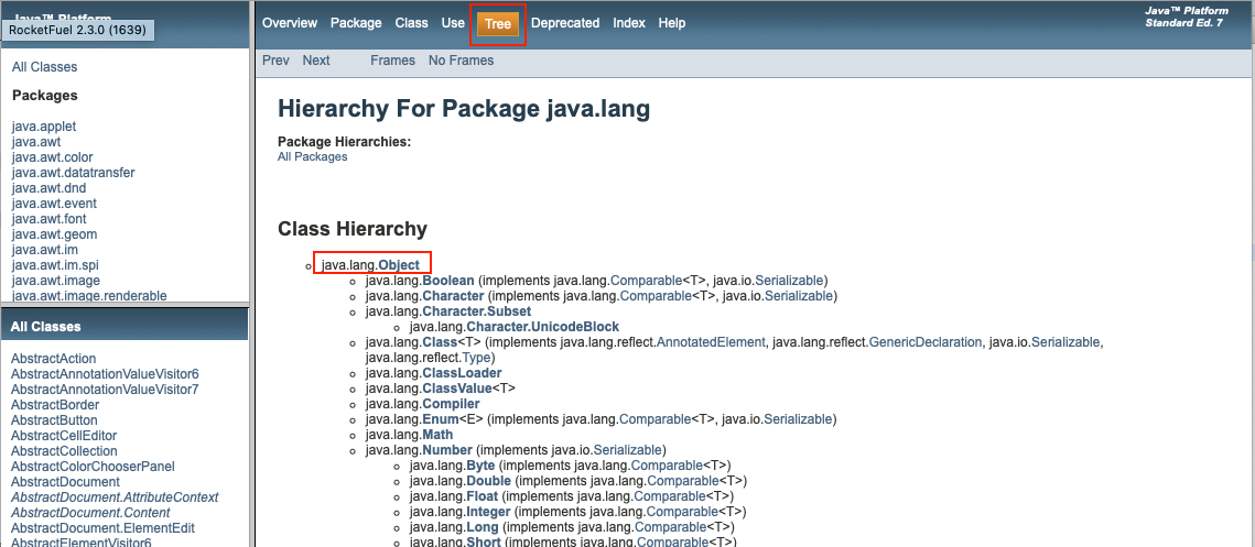 자바가 기본적으로 제공하는 표준 라이브러리의 클래스들이 서로 간에 어떤 상속 관계를 맺고 있는가를 보여준다. 그리고 그 최상위에는 Object 가 있다. 이 Object 가 갖고 있는 메소드 들을 모든 클래스가 공통적으로 사용할 수 있는 메소드 이기 때문에 Object 클래스가 갖고 있는 메소드의 의미와 쓰임을 알아보면 좋다.