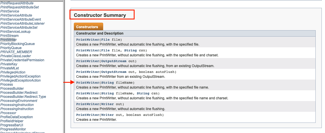 여러 Constructor 목록 중 우리가 사용했던 Constructor는 PrintWrite(STring fileName)이다.