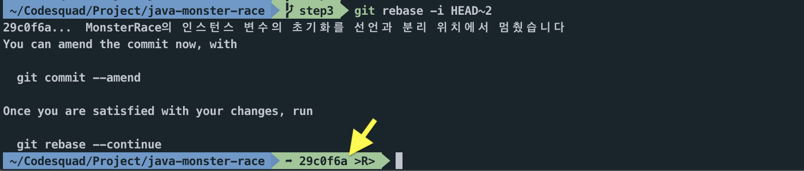 저장하고 편집기를 종료하면 Git은 목록에 있는 커밋중에서 edit 으로 변경한 커밋으로 이동하고, 아래와 같은 메시지를 보여주고, 명령 프롬프트를 보여준다.